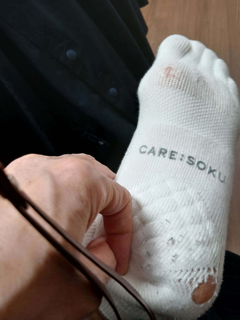 ところが、3回履いたら、なんと左足の親指の付け根と踵に穴が空いてました。