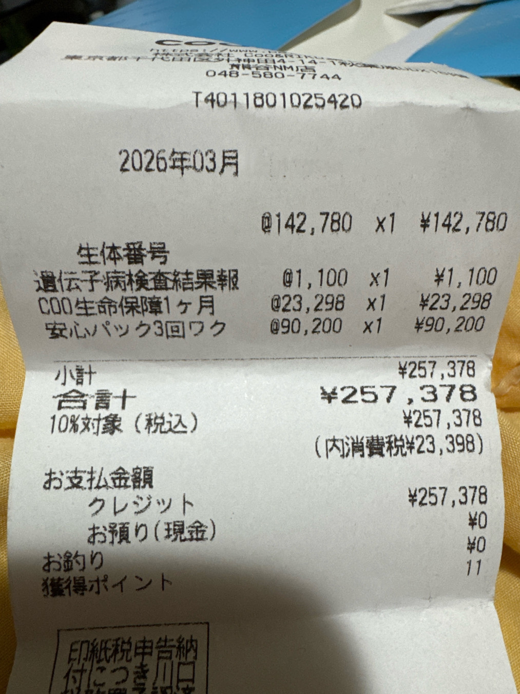 生体価格129,800円(税込142,780円)の表示しかないにも関わらず、購入を希望するとiPadを持ち出し、別途今までかかった医療費68,000円、ワクチン代14,000円、生命保障23,298円かかると言い出した。生命保障は不要と答えると、必須だと言われた。支払い必須の場合は表示価格に含めないといけないと店員に伝えたが、会社の方針と言われた。消費者庁と県に通報した。おとりに引っ掛からぬよう皆様お気をつけください。私は引っかかりました。