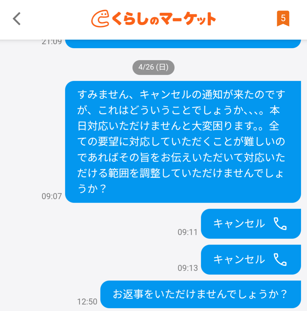 上記内容はくらしのマーケット内のメッセージにて行っている為くらしのマーケットも認識しているはずですが、