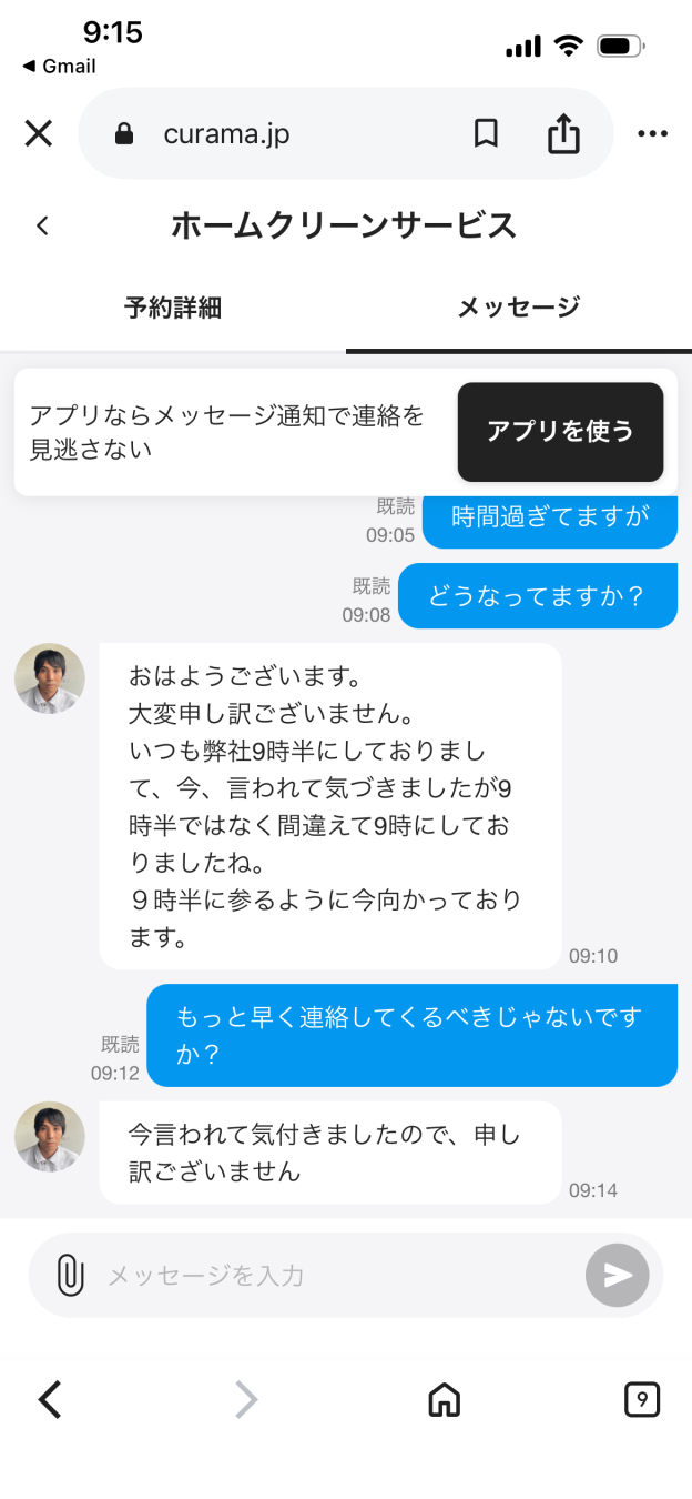 前日に「明日は予定通りお願い致します」とメッセージを送るが返信無し。もしかしたらと思ったが、約束の日時になっても、やっぱり来なかった。業者の電話番号も分からない。くらしのマーケットのサイトからはこの業者は検察できなくなっていた。くらしのマーケット側も状況は把握しているはず。