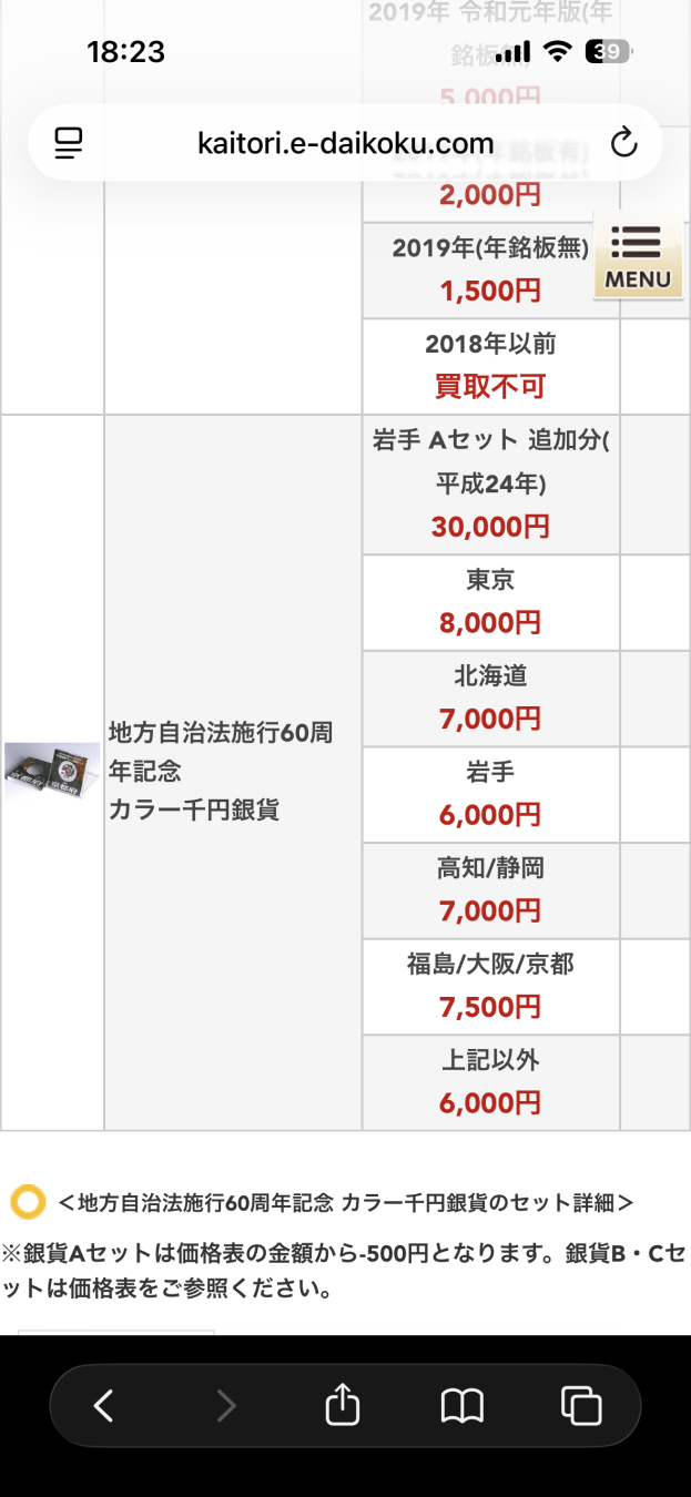 この会社のホームページで、例えば「地方自治法施行60周カラー千円銀貨」を12/30時点で都道府県にもよるけど6000円程で買い取りますみたいなことを平気で書いている。そもそも、この銀貨の販売価格が6000円くらいしていたし、この銀貨一枚のグラム数は約31グラム。12/26日の銀の正規の買取価格は1グラム410円(31×410)。単純に銀の価値だけでも12710円は下らない。いかに、この手のお店で売買してはいけないのかわかる。知らないと言うことは恐ろしい。