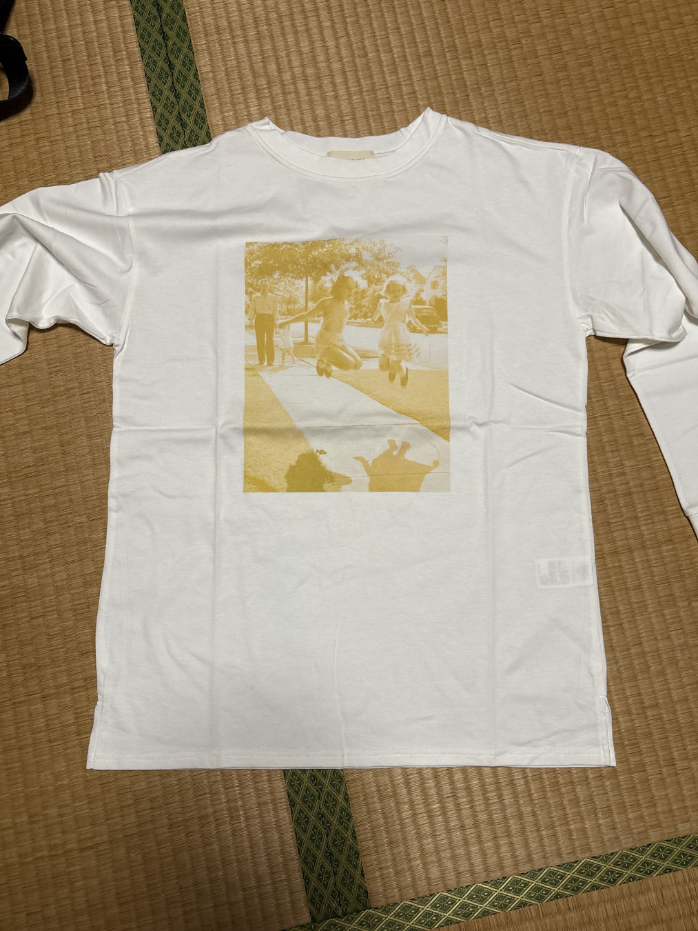 白Tは、前面に黄色の写真プリントついたヴィンテージ調??