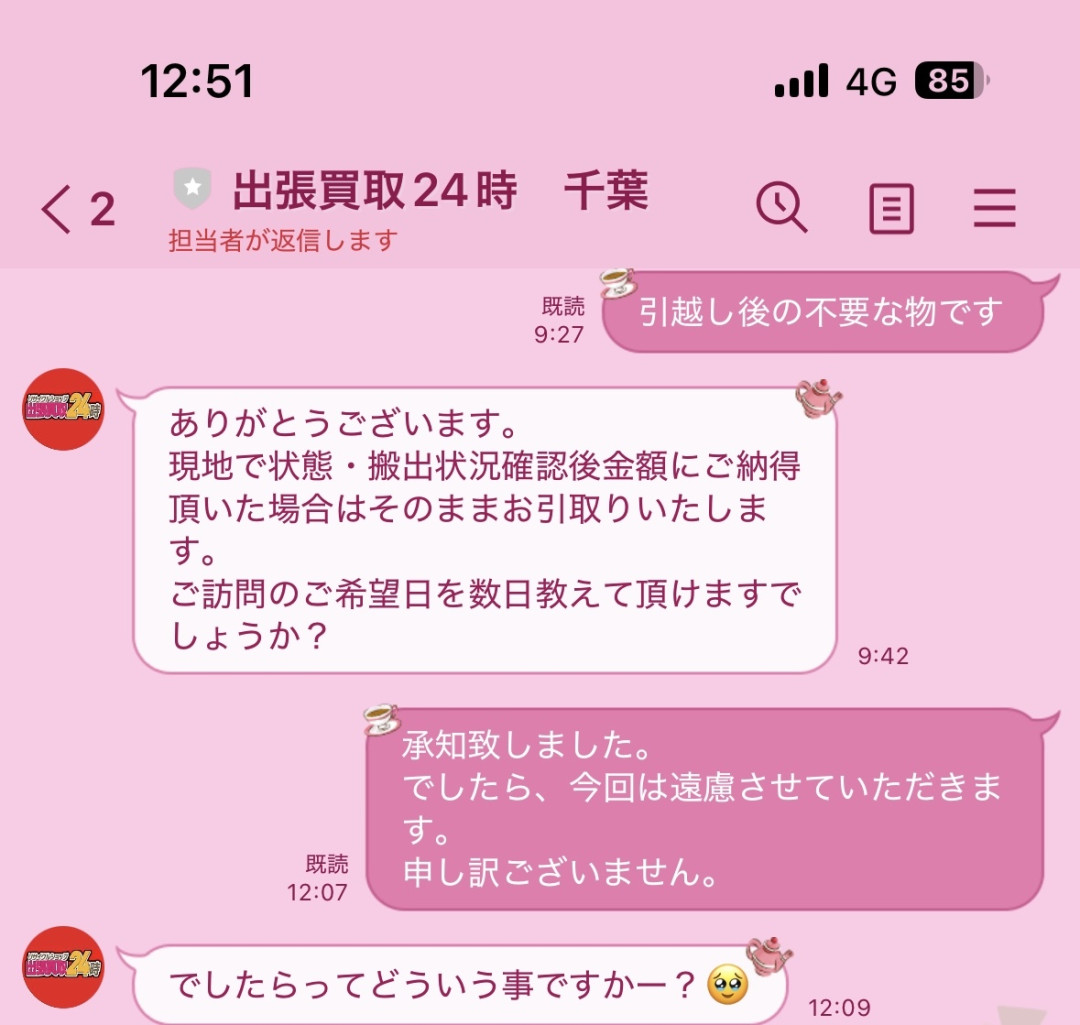 この24時以外にもいくつか打診しており、3社には電話時点で買い取り不可、1社は来てもらったものの有料での引き取りを提案され、本部と連絡すると言って音沙汰なし。