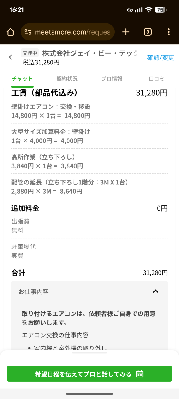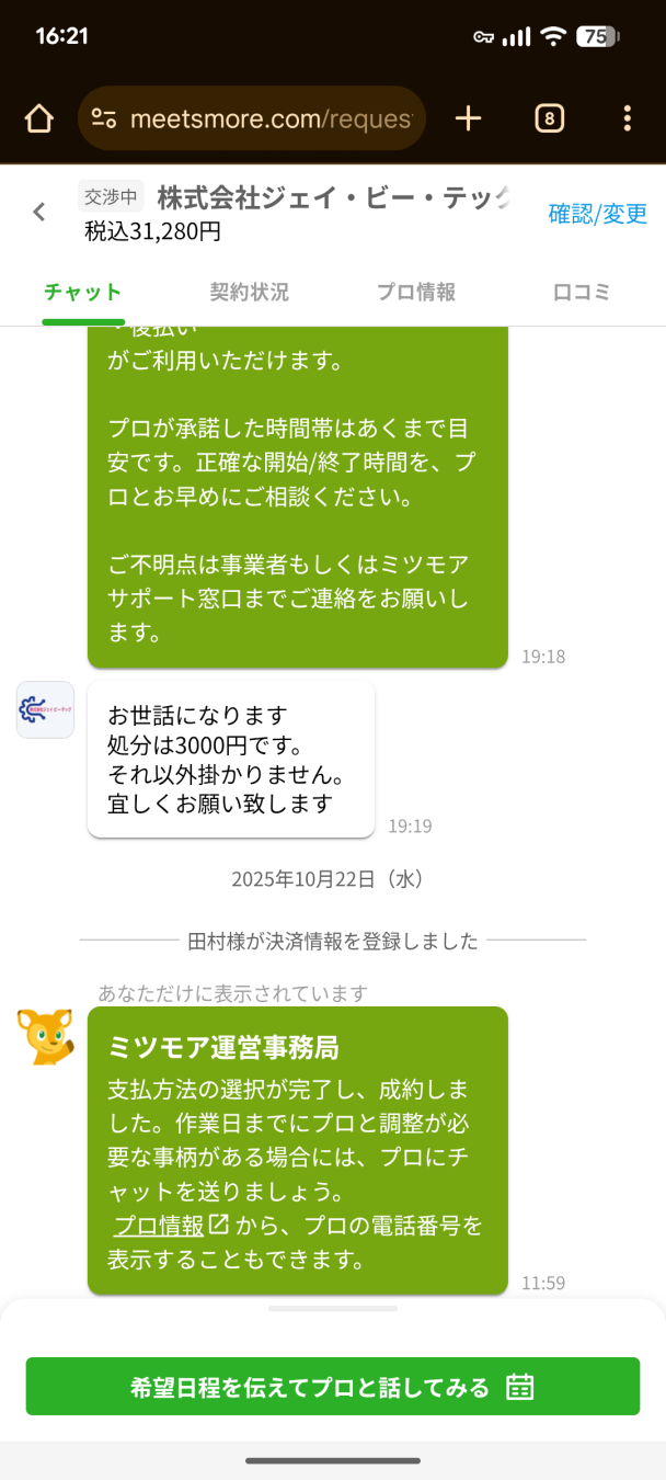 しかも出張先が遠方の場合高速料金は実費でしかお客様に請求できないのに高速料金の35%までミツモアが請求するようです。