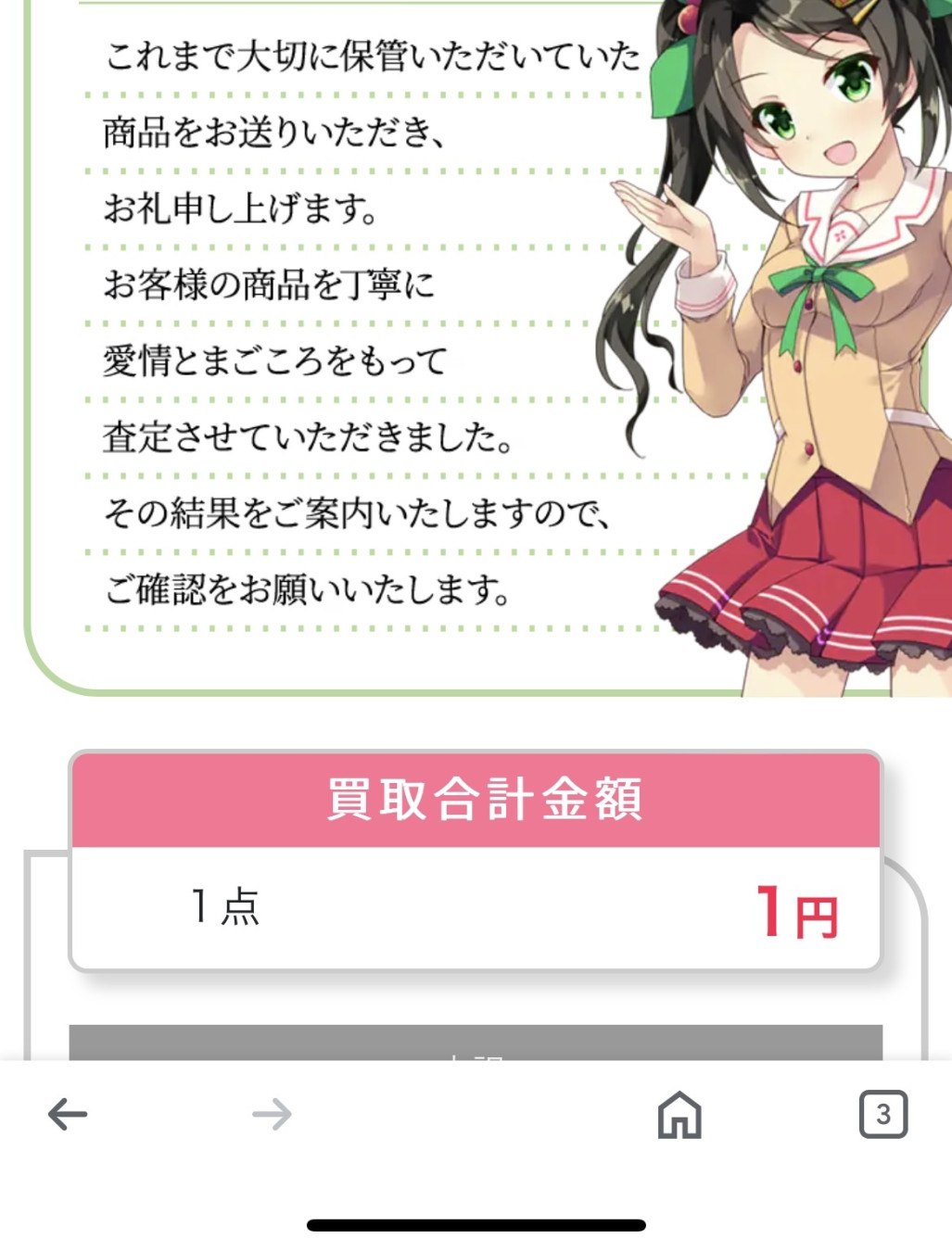 他社では数千円の値が付けられていたグッズたちで、信頼してみようと思ってそこからさらに追加して送ったので、もう少しはいくと思っていました。買い叩きにもほどがある。