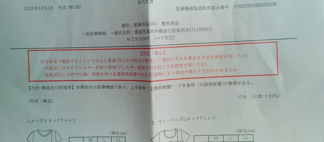 着るだけで疲労回復リカバリーウエアを購入しました。中身を開封すると、赤字で禁忌・禁止の文字か、施設に入っている母の為に購入しましたが、自身で着脱出来ない、アレルギー、炎症化膿ある場合禁止とあることを開封しないとわからないで購入させておいて、開封したら、返品不可との事でした。又、医療用は不可とも一点張りでした。