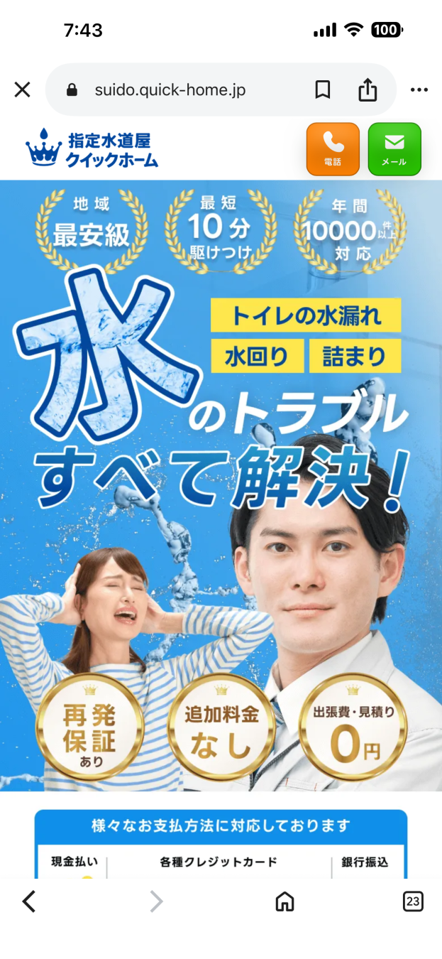 風呂場の排水溝が詰まって流れが悪くなったので頻繁に広告も入ってきてたからとりあえず連絡してみた。すぐに対応してくれたけど、変な液体を少し流して終わり。浴槽を外して工事しないと無理ですと言われた。液体流しただけで1万とられたけどな。