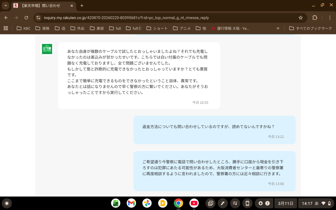 急いで楽天市場に連絡を取ろうとカスタマーサービスへ連絡するが、チャット方式でテンプレートの回答ばかりで埒があかない。