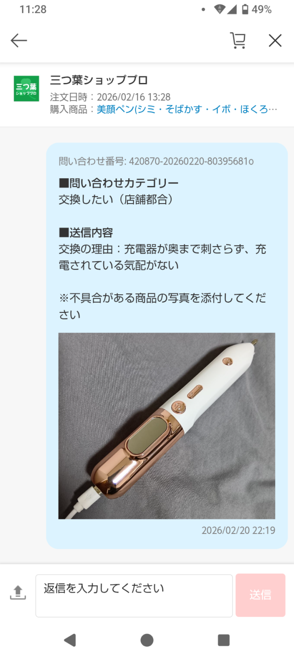 そういった場合には保証申請を、とあったので入力を進めていたら画像が送れず。普通にiPhoneで撮影したもので、画素数を下げたりしても駄目でした。