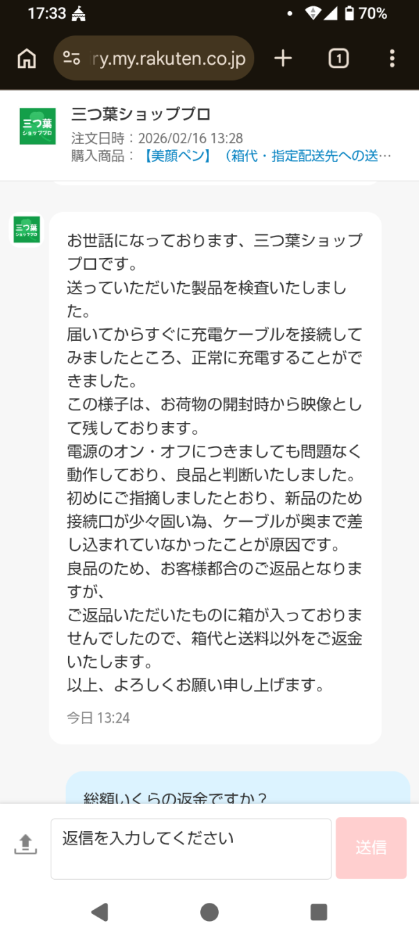 本当は星一つも付けたくないが、返金してもらえた事と楽天からの謝罪のメールがあったので1つはつけました。