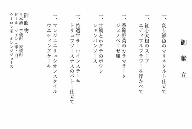 式は提携先の青山のフレンチレストランを利用しました。全体的に不満は無かったのですが、食事メニューが急遽変更になった事とその対応についてだけは納得がいっていません。