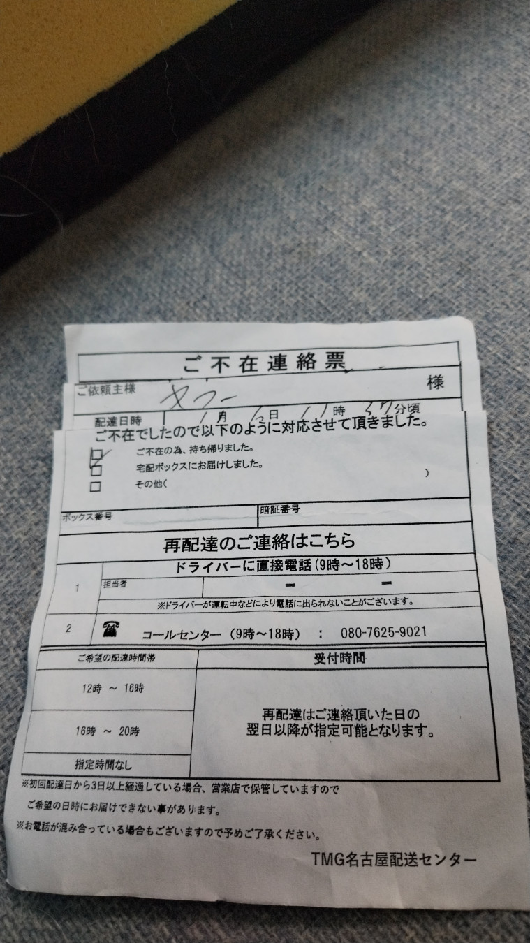 1/6にドライバーがうちに来たが肝心の荷物を持っておらず、向かい側にある違うマンションの、私と同じ部屋番号の宅配ボックスに入れてしまったらしい。